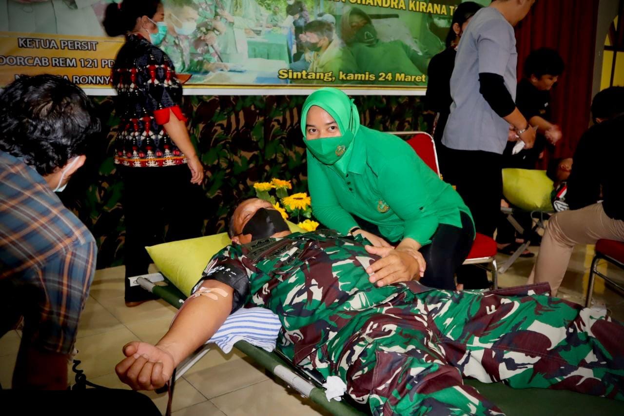 Sintang, Persit KCK Koorcab Rem 121 PD XII Tanjungpura, menggelar kegiatan donor darah untuk memperingati HUT Persit Kartika Chandra Kirana (KCK) ke-76 yang jatuh pada tanggal 6 April 2022, kegiatan ini dilaksanakan di Balai Prajurit Korem 121/Abw, Jl. Pangeran Kuning No. 1, Kel. Tanjungpuri, Kec. Sintang, Kab. Sintang, Kalimantan Barat, Kamis (24/03/2022).
