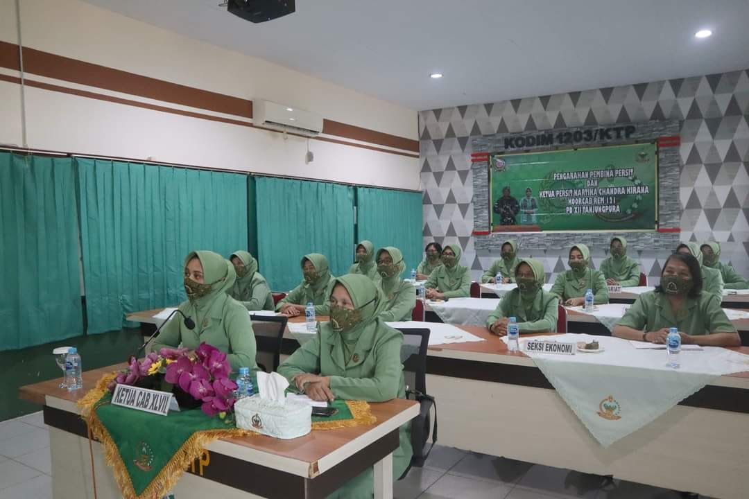 Ketapang- Melalui Video Conference, Ketua Persit KCK Cabang XLVII kodim 1203 Ny. Minggar Alim Mustofa beserta Ibu Pengurus Persit KCK Cabang XLVII kodim 1203 menerima Pengarahan Pembina Persit Komandan Korem 121/Abw, Brigjen TNI Dr. Ronny, S.A.P dan Ibu Ketua Persit KCK Koorcab Rem 121 PD XII Tanjungpura Ibu Rissa Ronny di Makodim 1203/ktp, Jalan. Letjend S. Parman, Kecamatan Delta Pawan, Kabupaten Kabupaten Ketapang, Rabu (23/3/2022).
