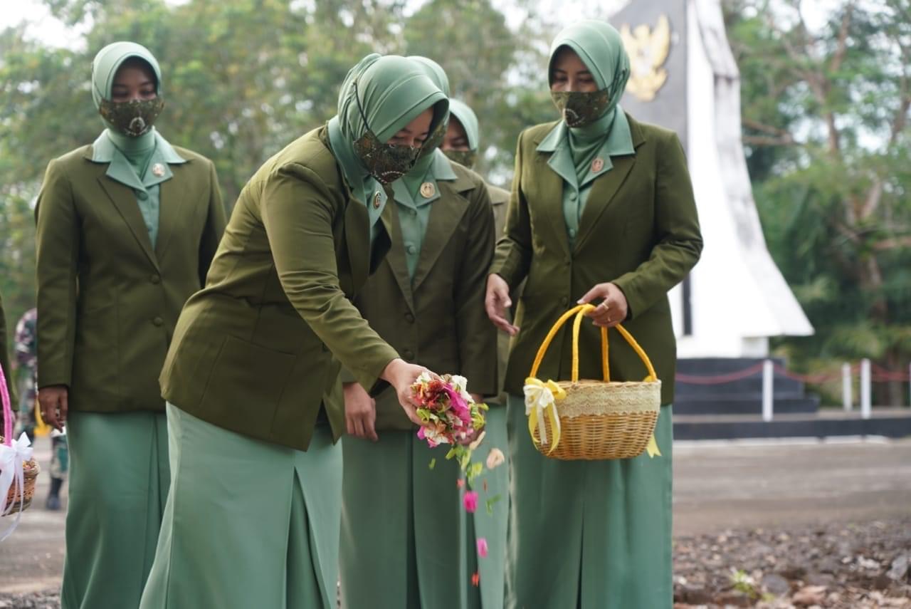 Sanggau, Peringati Hari Ulang Tahun (HUT) Persit Kartika Chandra Kirana ke-76 tahun 2022, Ketua Persit KCK Koorcab Rem 121 PD XII Tanjungpura Ibu Rissa Ronny beserta pengurus Koorcab Rem 121 ziarah di Taman Makam Pahlawan Patriot Bangsa Sanggau, Kalimantan Barat, Jum’at (1/4/2022).
