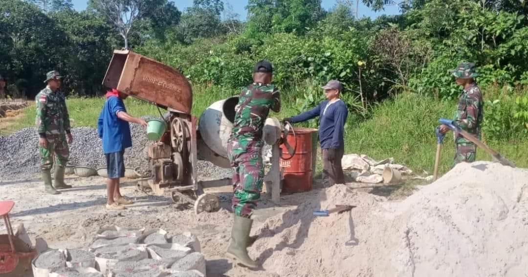 Senaning,-Anggota Satgas Pamtas RI-Malaysia Yonif 144/JY melaksanakan gotong royong Pengecoran Masjid Baiturrahim di desa Senaning Kecamatan Ketungau Hulu Kabupaten Sintang Kalbar.