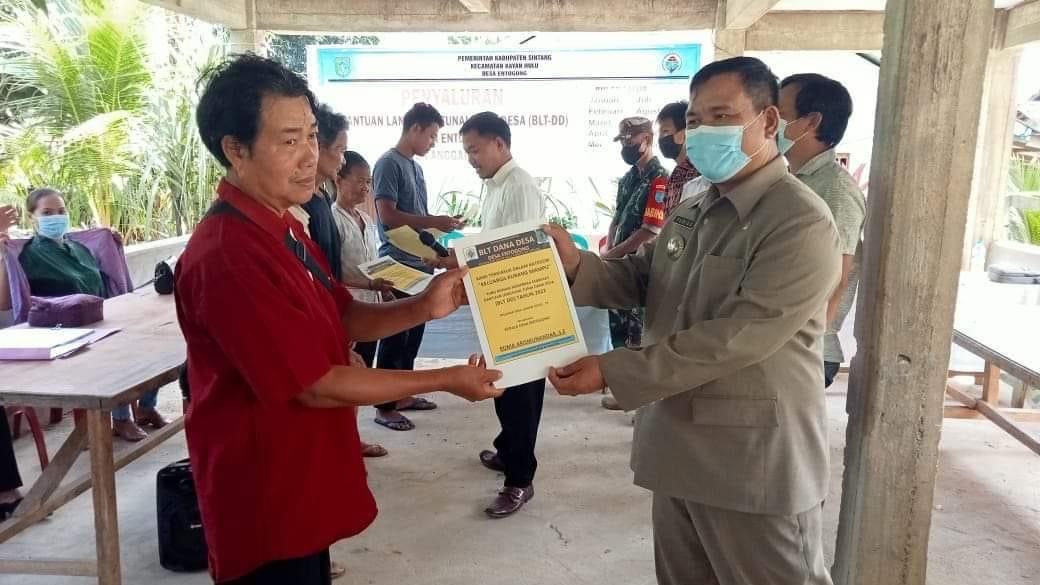 Penyerahan dana BLT dilakukan langsung oleh Kepala Desa Entogong, Roma Arismunandar, S.E kepada masyarakat yang berhak menerima di Desa Entogong.
