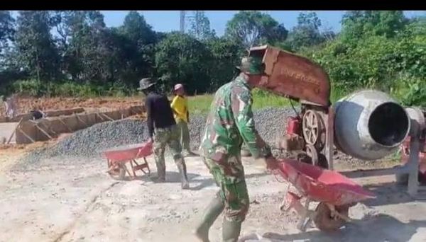 Senaning,-Anggota Satgas Pamtas RI-Malaysia Yonif 144/JY melaksanakan gotong royong Pengecoran Masjid Baiturrahim di desa Senaning Kecamatan Ketungau Hulu Kabupaten Sintang Kalbar.