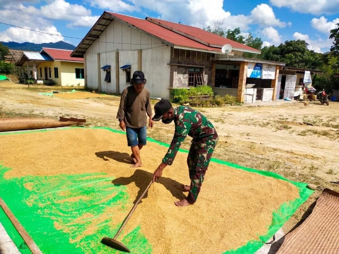 Kantuk Asam,-Anggota Satgas Pamtas RI-Malaysia Yonif 144/JY laksanakan menjemur padi bersama warga di desa Kantuk asam kecamatan Puring Kencana Kabupaten Kapuas Hulu Kalbar.