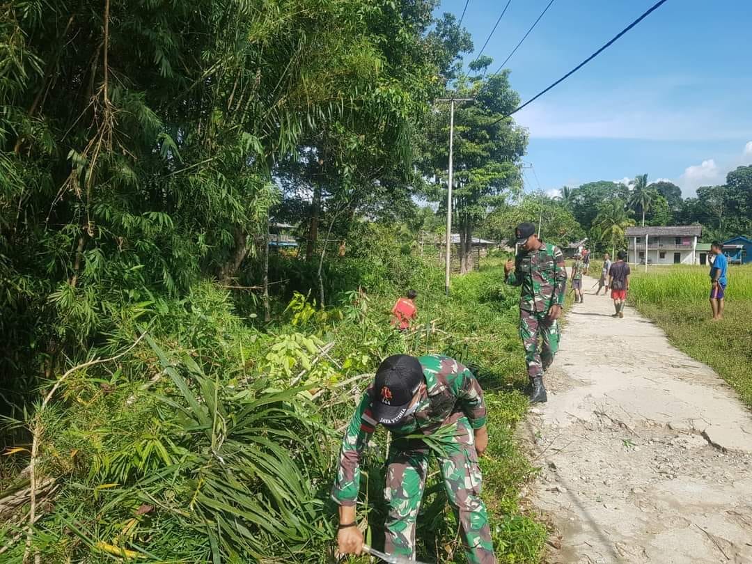 Sertu M Riza beserta empat rekannya”,Kami bersama warga bersihkan jalan desa ini secara bergotong royong mulai dari pemotongan rumput yang menjalar ke jalan”, harapannya dengan di bersihkan jalan desa, tambah kelihatan rapi warga pun lebih nyaman untuk melintas”, imbuhnya.