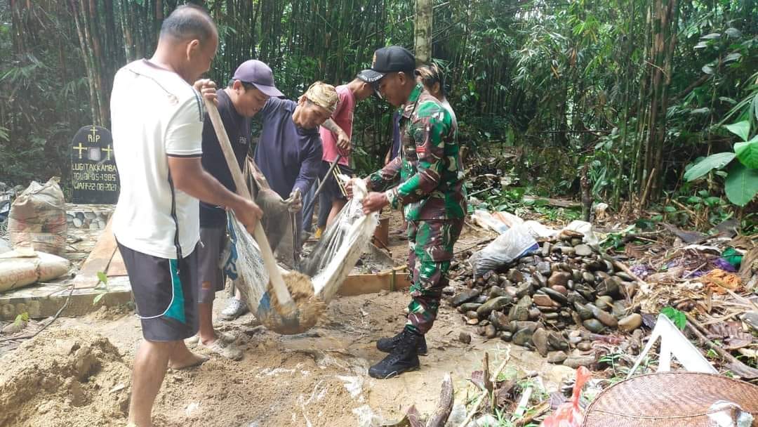Pratu Yahya beserta dua rekannya”,kami bantu pengecoran makam warga mulai dari pengangkatan pasir dan semen”, imbuhnya.
