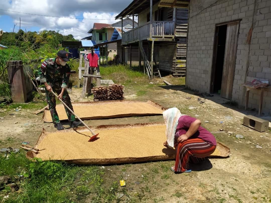 Langau dua,-Anggota Satgas Pamtas RI-Malaysia Yonif 144/JY bantu warga jemur Padi darat di desa Langau dua Kecamatan Puring Kencana Kabupaten Kapuas Hulu Kalbar.