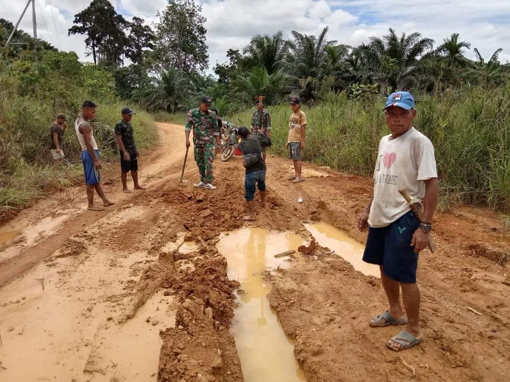 Dikatakannya Pak Tikin selaku kepala dusun”,dalam Minggu ini sering turun hujan yang deras mengakibatkan jalan desa ini banyak yang berlobang sehingga terjadi genangan air,kami bersama bapak Satgas secara bekerjasama Benahi jalan desa ini, kehadiran bapak satgas di desa kami sangat terbantukan, kalau tidak segera diperbaiki akan bertambah lobang sehingga menyulitkan bagi warga untuk melintas”, Pungkasnya.