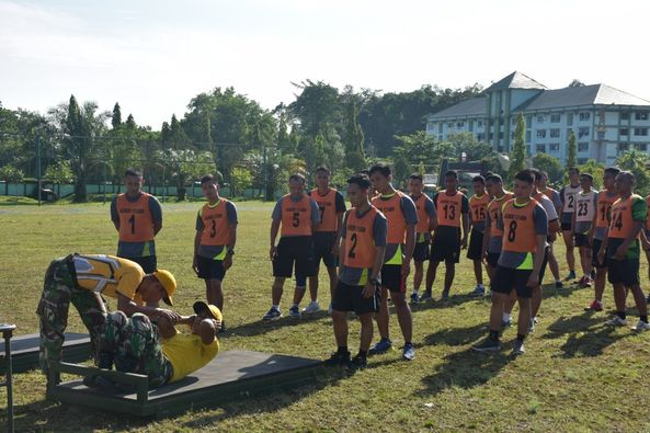 Sintang, Prajurit Korem 121/Abw dan jajaran melaksanakan kegiatan kesegaran jasmani (Garjas) Periodik I dan UKP (ujian kenaikan pangkat) TA. 2022 di lapangan Shuttle Ban Korem 121/Abw, Jl. Pangeran Kuning, No.1, Kel.Tanjungpuri, Kec.Sintang, Kab. Sintang, Kalimantan Barat, Rabu (18/5/2022).