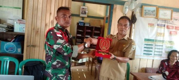 Anggota Satgas pos Sei Beruang memberikan cinderamata berupa plakat simbol satuan yonif 144/JY, kepada kepala sekolah SDN 25 Mini ,ini merupakan bentuk kenangan sebagai bukti tanda adanya kita saling bekerjasama dalam mencerdaskan anak-anak bangsa yang ada di perbatasan.