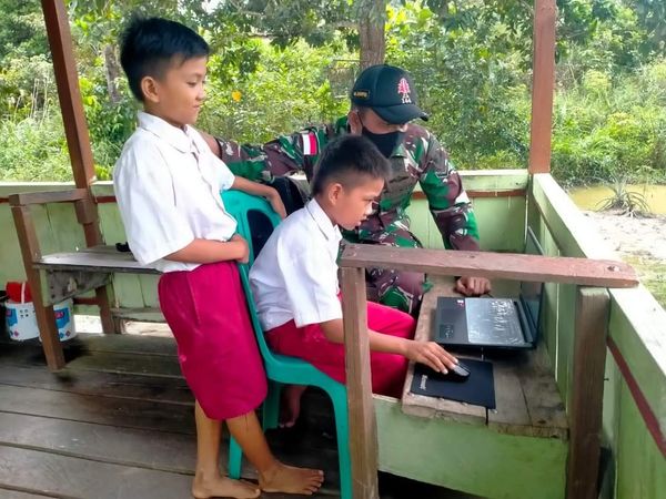 Serda M Nofik beserta dua rekannya”, Seiring dengan kemajuan zaman modern sekarang ini kita haru peduli dan mengajarkan kepada anak-anak di perbatasan,biar mereka paham dan mengerti sehingga mereka apabila di hadapkan dengan ujian sekolah secara online mereka bisa mengoperasionalkan komputer maupun laptop.