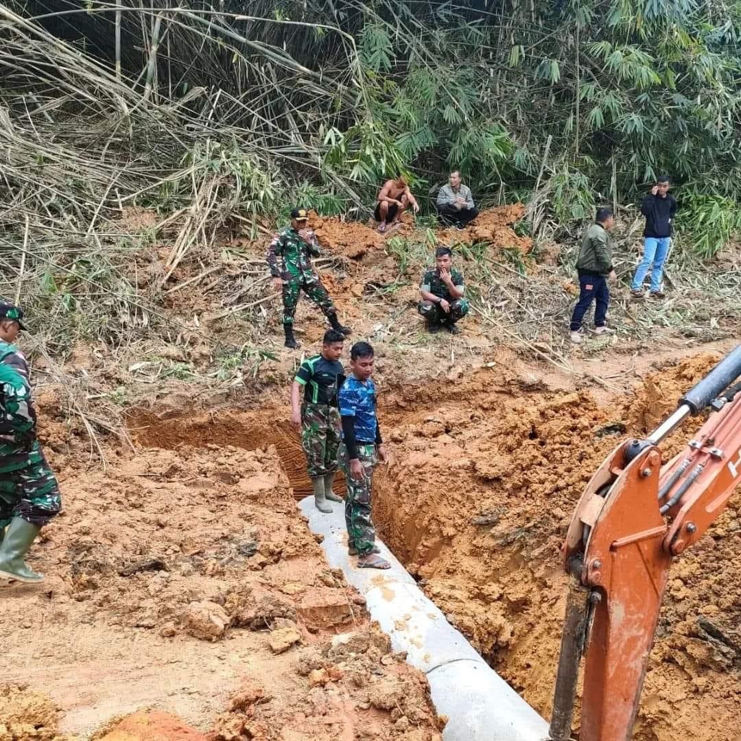 Warga masyarakat Dusun Selampung , Desa Selampung, Kecamatan Jangkang Kabupaten Sanggau bersama anggota Satgas TMMD Regtas ke-113, bergotong royong untuk memasang gorong – goreng,