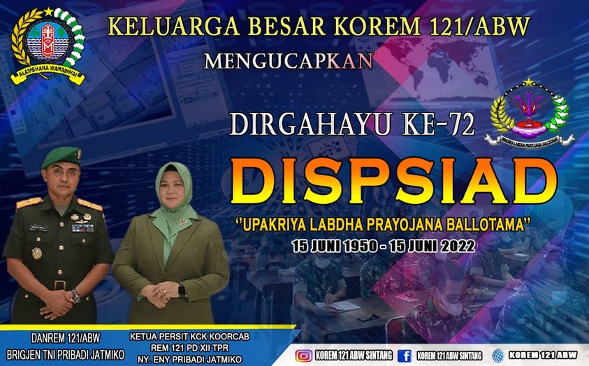 KELUARGA BESAR KOREM 121/ABW MENGUCAPKAN DIRGAHAYU KE – 72 DISPSIAD 14 Juni 2022 oleh Redaksi Korem 121/abw KELUARGA BESAR KOREM 121/ABW MENGUCAPKAN DIRGAHAYU KE – 72 DISPSIAD