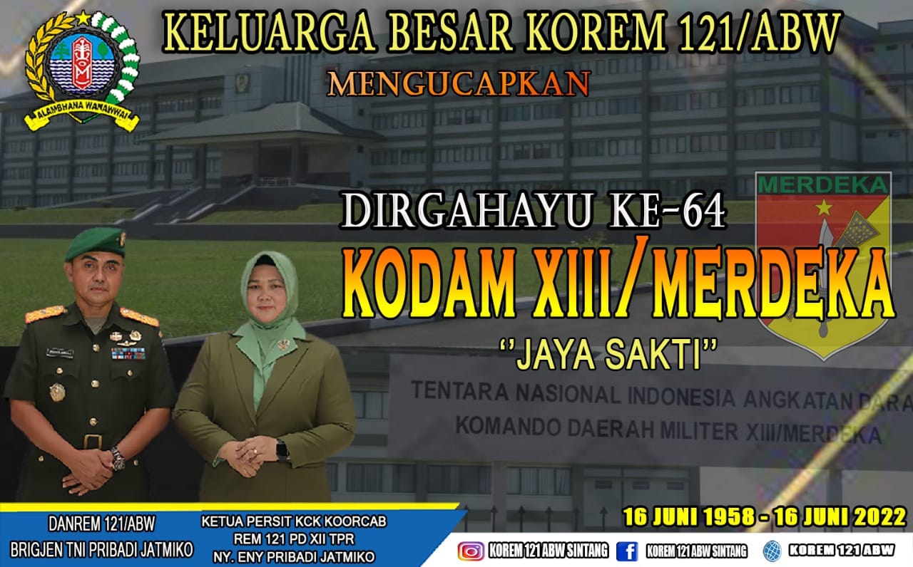 KELUARGA BESAR KOREM 121/ABW MENGUCAPKAN DIRGAHAHYU KE – 64 KODAM XIII/MERDEKA 16 Juni 2022 oleh Redaksi Korem 121/abw KELUARGA BESAR KOREM 121/ABW MENGUCAPKAN DIRGAHAHYU KE – 64 KODAM XIII/MERDEKA