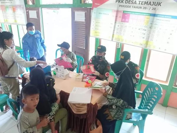 2 orang personel Pos Camar bulan dan Pos Temajuk Takes Satgas Pamtas Yonif 645/Gty Tri Afandi dan Prada Ali membantu para tenaga kesehatan (Nakes) Puskesmas Desa Temajuk dalam kegiatan bakti kesehatan Pos Pelayanan Terpadu (Posyandu) di Dusun.camar bulan Desa. Temajuk Kec. Paloh Kab. Sambas. Ujar Dansatgas