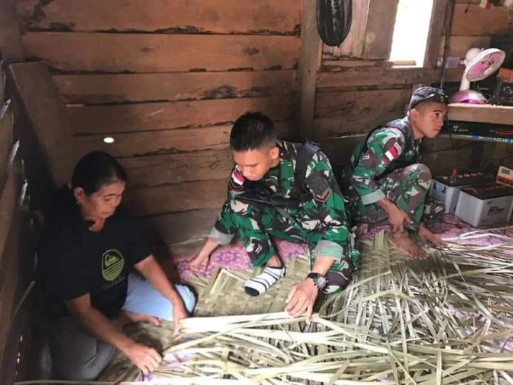 SINTANG – Dalam rangka membangun kedekatan dengan masyarakat, Personel satgas pamtas Yonarmed 19/105 Trk Bogani Pos Muakan yang dipimpin oleh Serda Ivander Jack bersama 4 personel membantu membuat kerajinan tangan berupa tikar anyaman di Desa Muakan Petinggi, Kecamatan Senaning, Kabupaten Sintang. (Sabtu, 25 Juni 2022)