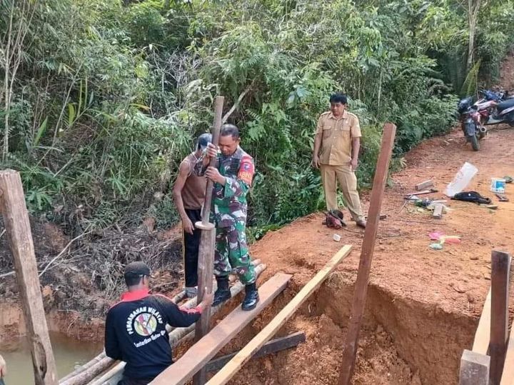 Ketapang – Cuaca panas terik matahari tak menyurutkan semangat Babinsa Koramil 1203-01/Nanga Tayap bersama masyarakat bergotong royong dalam mengerjakan pembuatan jembatan kayu. Senin (27/6/2022)