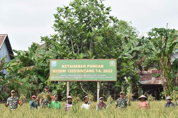Sintang – Babinsa Koramil 1205 – 06/Sepauk bersama warga masyarakat Desa Manis Raya melaksanakan panen perdana padi di lahan Demplot Kodim 1205/Sintang yang bertempat di Desa Manis Raya, Kecamatan Sepauk, Sintang, Kamis (30/06/2022).