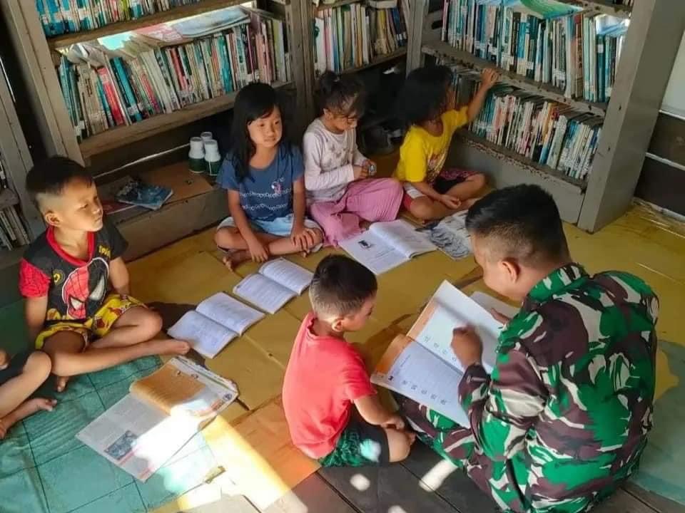SINTANG – Personel Satgas Pamtas Yonarmed 19/105 Trk Bogani Pos Nanga Bayan mengajak anak-anak untuk gemar membaca buku. Kegiatan tersebut dilakukan dalam rangka untuk menumbuhkan kebiasaan baik terhadap anak-anak sejak usia dini untuk hobi membaca dengan memanfaatkan buku-buku bacaan yang dimiliki oleh Pos Nanga Bayan Satgas Pamtas di Desa Nanga Bayan, Kecamatan Ketungau Hulu, Kabupaten Sintang, Kalimantan Barat. (Senin, 4 Juli 2022)