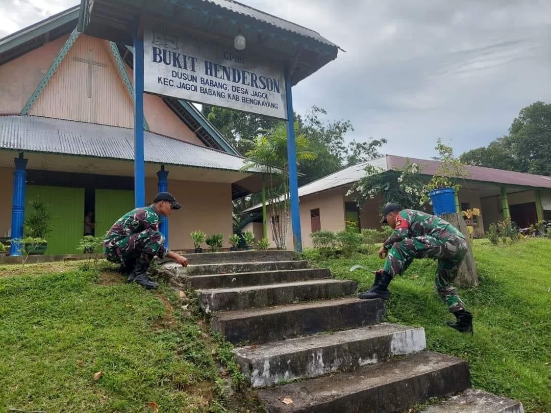 Bengkayang, Kalbar – Personel Satgas Pamtas Yonif 645/Gty Pos Komando Utama (Kout) Dipimpin Pabintal Satgas, Letda Inf Andi Muh Pagelipu bersama masyarakat bergotong royong membantu bersihkan area sekitaran Gereja Protestan Bukit Henderson di Kp. Jagoi Dalam, Dsn. Jagoi Babang, Desa Jagoi Babang, Kec. Jagoi Babang, Bengkayang.