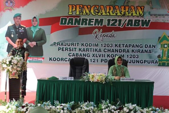 Ketapang- Sambangi Kodim 1203/Ktp yang pertama kalinya, Danrem 121/Abw, Brigjen TNI Pribadi Jatmiko Dan Ketua Persit KCK Koorcab Rem 121 PD XII/Tanjungpura Ny. Eni Pribadi Jatmiko memberikan pengarahan kepada Prajurit dan Persit KCK, Cabang XLVII Kodim 1203, Koorcab Rem 121 PD XII/Tanjungpura yang berlangsung di Makodim 1203/Ktp, Senin (11/7/2022)