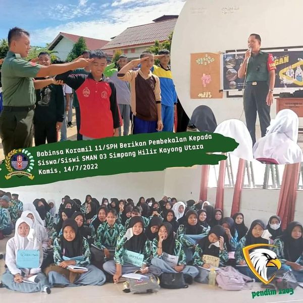 Dalam keterangannya, Pj. Danramil 1203-11/Simpang Hilir Peltu Nanang Koswara mengatakan, Serka Zulkarni dan Sertu Baharudin beserta beberapa anggota lainya memberikan materi wawasan kebangsaan kepada kaum muda dengan bekerja sama dengan pihak sekolah dalam rangka meningkatkan rasa cinta tanah air dan bela negara melalui pengetahuan serta pengamalan Pancasila dan UUD 1945.