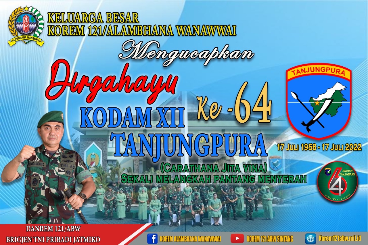 KELUARGA BESAR KOREM 121/ALAMBHANA WANAWWAI MENGUCAPKAN DIRGAHAYU KE – 64 KODAM XII/TANJUNGPURA 17 Juli 2022 oleh Redaksi Korem 121/abw KELUARGA BESAR KOREM 121/ALAMBHANA WANAWWAI MENGUCAPKAN DIRGAHAYU KE – 64 KODAM XII/TANJUNGPURA