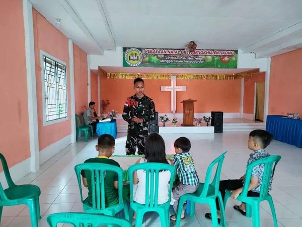 ENTIKONG, KALBAR − Kehadiran Pos Gabma Entikong Satgas Pamtas RI-MLY Yonif 645/GTY dapat dirasakan manfaatnya oleh masyarakat perbatasan dengan turut andil ikut mengajar kegiatan ibadah Sekolah Minggu untuk anak-anak sekitar pos perbatasan, bertempat di Gereja GKTI Antiokhia Entikong Kab. Sanggau. Minggu, (17/07/2022).