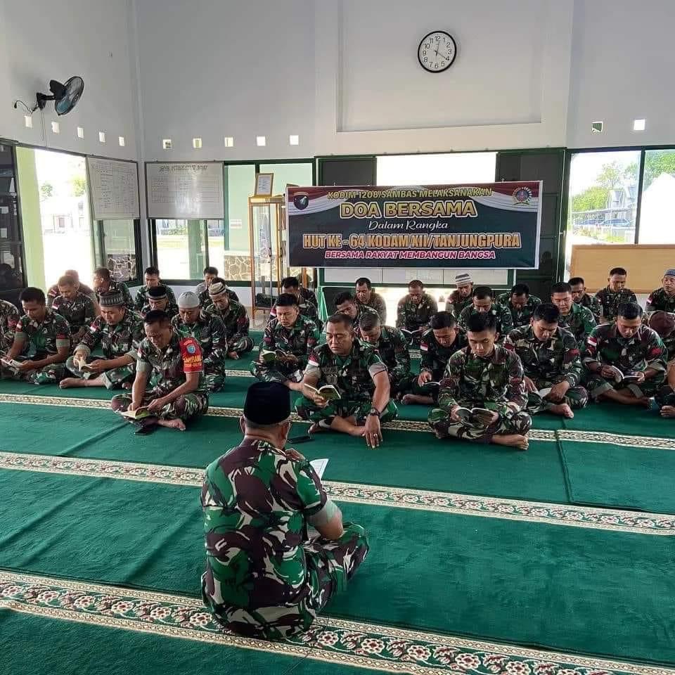 Anggota Kodim 1208/Sambas melaksanakan Doa bersama Rangka HUT Kodam XII/Tpr Ke-64, kegiatan digelar di Masjid Mujahidin Makodim Jalan Tabrani, Desa Lumbang , Kec. Sambas, Kab. Sambas.