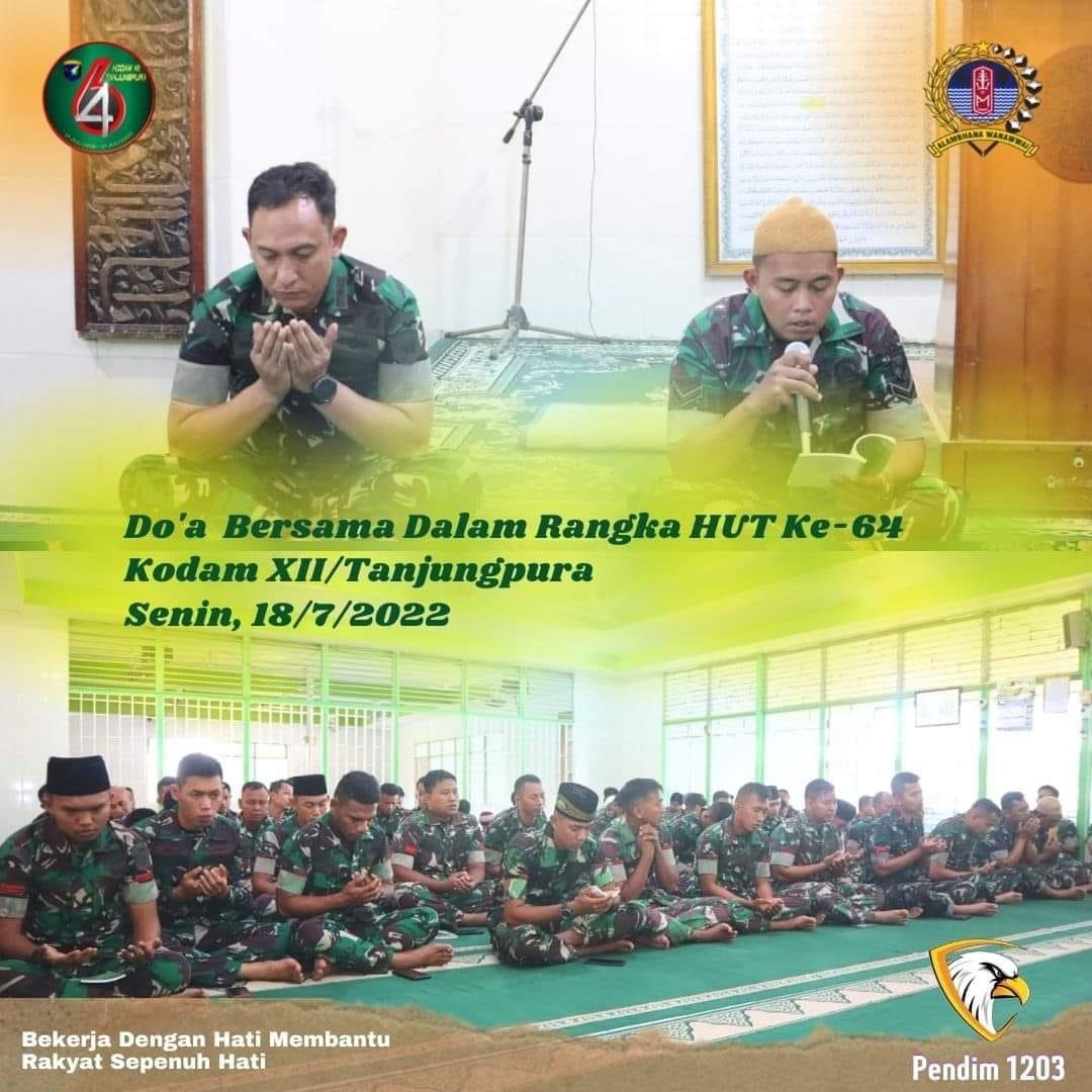 Dandim 1203/Ktp Letkol Inf Alim Mustofa yang mengatakan bahwa Do’a Bersama ini dilaksanakan dalam rangka memperingati HUT Kodam XII/Tpr Ke-64 Tahun 2022.