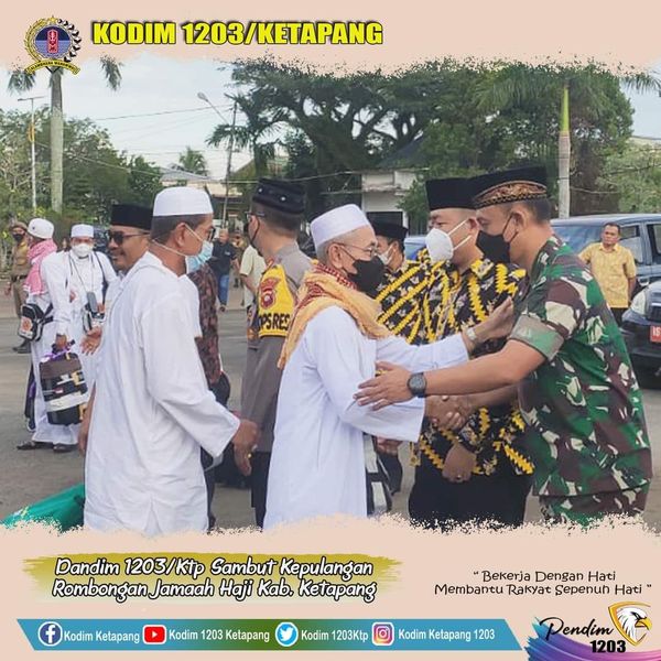 Ketapang – Dandim 1203/Ktp Letkol inf Alim Mustofa bersama seluruh unsur Forkopimda Ketapang DPRD, MUI Kab. Ketapang Kementerian Agama, OPD, Tokoh Agama, Dan Tokoh Masyarakat menyambut kepulangan Rombongan Jamaah Haji asal Kabupaten Ketapang.