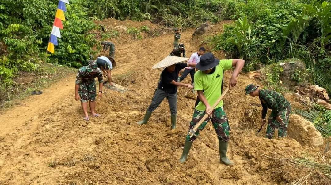 Kapuas Hulu – Anggota Satgas TMMD Reguler Ke-114 Kodim 1206/Psb bersama dengan warga Desa Bahenap, Kecamatan Kalis, Kabupaten Kapuas Hulu, meratakan jalan yang dengan alat seadanya,Minggu (31/7/2022),