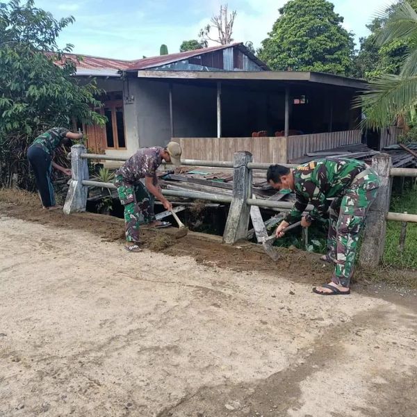 Plh Danramil 05 Noyan Serka Santosa Paul saat memimpin anggotanya dalam kegiatan bersih- bersih menyampaikan, keputusan melakukan pembersihan dan pengecatan jembatan ini merupakan bagian dari persiapan menyambut hari kemerdekaan RI ke 77 .