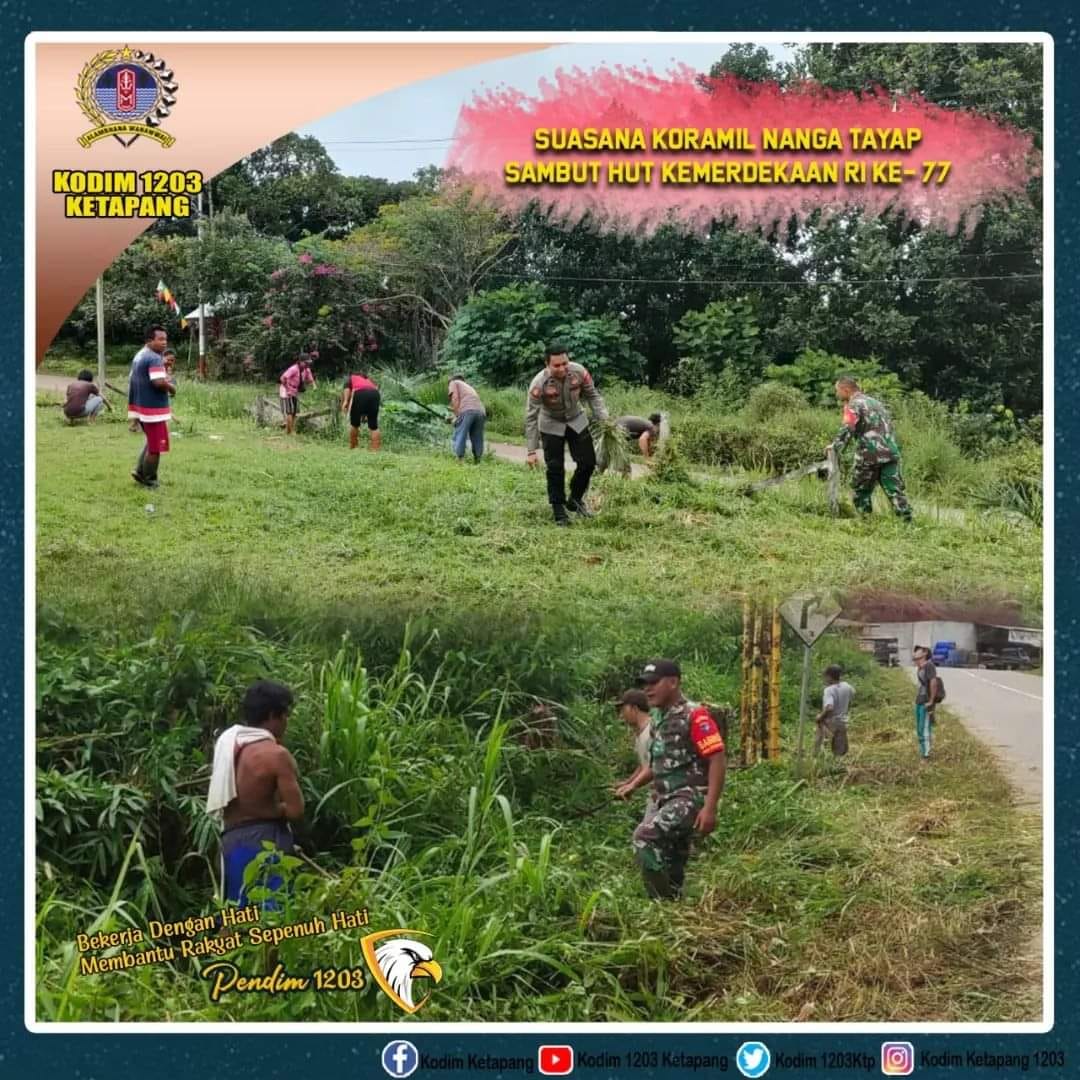 Ketapang – Babinsa Koramil 1203-01/Ng.Tayap bersama mitra karibnya melaksanakan persiapan-persiapan menyambut HUT Kemerdekaan Republik Indonesia ke-77 Tahun 2022, diantaranya melaksanakan kerja bakti atau bersih-bersih diwilayahnya masing-masing.