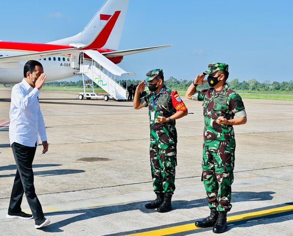 Pontianak, Presiden Republik Indonesia, Joko Widodo bersama Ibu Iriana tiba di Bandara Supadio Pontianak, Provinsi Kalimantan Barat. Setibanya orang nomor satu di Indonesia ini disambut oleh Pangdam XII/Tpr Mayjen TNI Sulaiman Agusto, S.I.P., M.M., Gubernur Kalimantan Barat H. Sutarmidji, S.H., M.Hum. dan Danrem 121/Abw Brigjen TNI Pribadi Jatmiko beserta unsur Forkompinda Kalbar lainnya. Selasa (09/08/2022).