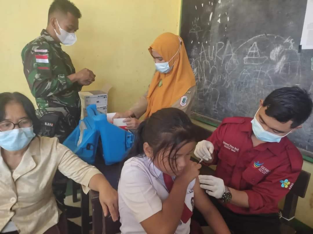 “Tim kesehatan Satgas Pamtas Yonarmed 19/105 Trk Bogani kita kerahkan untuk berkolaborasi dengan tenaga kesehatan setempat untuk membantu dalam pemberian vaksin kepada siswa di SDN 08 Sebindang.” Ujar Dan Satgas.