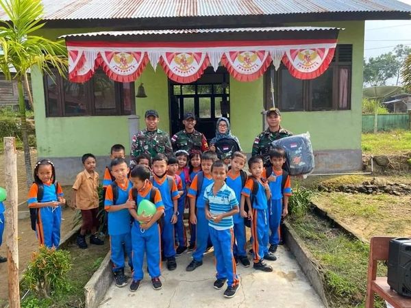 Sambas, Kalbar – Pos KM 28 Satgas Pamtas Yonif 645/Gty Dipimpin Danpos langsung beserta 4 orang anggota mendistribusikan Sargal untuk Murid-Murid berprestasi SDN 03 Aruk perbatasan berupa Tas Sekolah Mabes TNI sekaligus Dalam Rangka Menyambut dan Memperingati HUT Kemerdekaan Republik Indonesia ke-77, bertempat di Dsn. Aping Ds. Sebunga Kec. Sajingan Besar Kab. Sambas. Jumat, 12 Agustus 2022