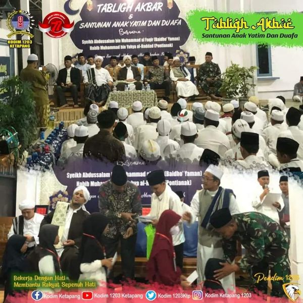 Acara tersebut dalam rangka Peringatan Tahun Baru Islam 1444 H yang di hadiri oleh Wabup Ketapang H. Farhan, SE.,M.Si, Pengasuh Ponpes Mambaul Khairat KH. Abdullah Al Faqir, Ketua PCNU Ketapang H. Satuki Huddin, Habib Muhammad Bin Yahya Al-Hadad ( Penerjemah Tausiyah ) Pasilog Kodim 1203/Ktp Letda Inf M. Aris, unsur forkopimcam Benua Kayong, Tokoh Masyarakat, Tokoh Agama, Para Santri Serta Penerima santunan.