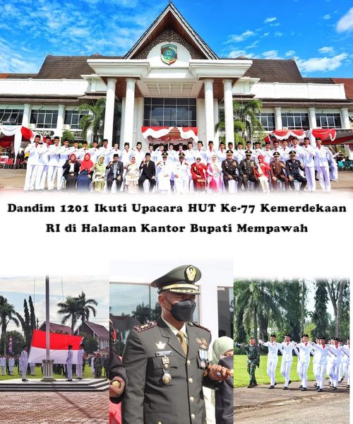 Mempawah – Komandan Kodim 1201 Mempawah Letkol Inf. Daru CayoAlam mengikuti prosesi upacara detik-detik proklamasi kemerdekaan RI ke-77 yang dilaksanakan di halaman kantor Pemerintahan Kabupaten Mempawah, Jl. Daeng Manambon, Kelurahan Tengah, Kecamatan Mempawah Hilir, Kabupaten Mempawah, Rabu (17/8/2021).
