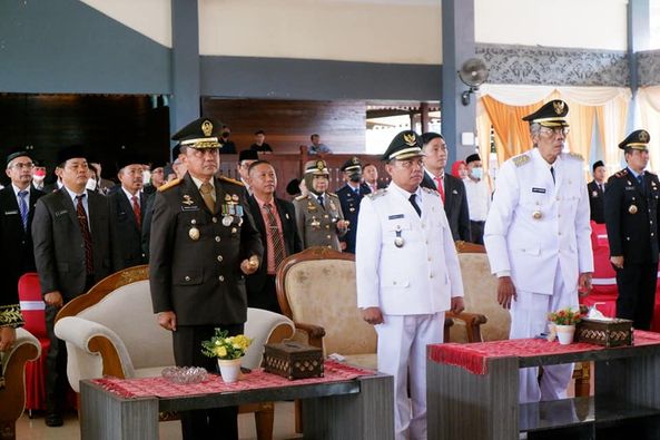 Sintang, Komandan Korem Danrem 121/Abw Brigjen TNI Pribadi Jatmiko mengikuti upacara Detik-Detik Proklamasi yang di gelar secara virtual dengan Irup Presiden RI Ir H. Joko Widodo, Rabu (17/08/2022).