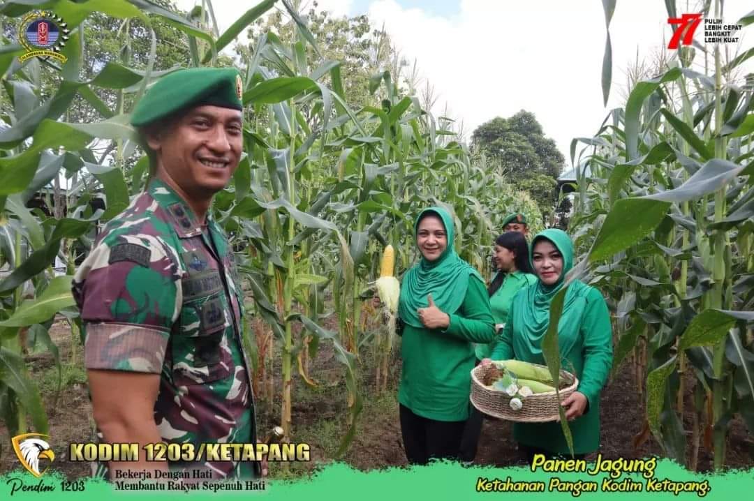 Ketapang – Dandim 1203/Ktp Letkol Inf Alim Mustofa bersama Ketua Persit KCK Cabang XLVII Kodim 1203, Ny. Minggar Alim Mustofa, pagi ini memimpin panen jagung di Kebun Persit Kodim Ketapang yang berada di sekitar kantor Makodim, Jum’at (19/8/2022).
