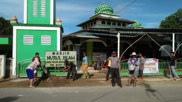 Kayong Utara – Berat sama dipikul ringan sama dijinjing begitulah kira-kira kekompakan Babinsa Koramil 15/Tl. Batang, Jajaran Kodim 1203/Ktp, Serda Munaki bersama masyarakat dan Anggota Polsek Teluk Batang memanfaatkan hari libur dengan bergotong royong di Masjid Nurul Islam, Desa Teluk Batang Selatan, Kec. Teluk Batang, Kab. Kayong Utara. Minggu (21/8/2022).