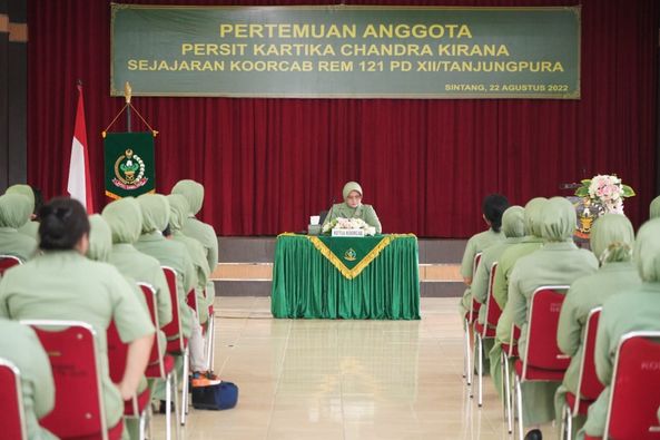 Sintang, Persit KCK Koorcab Korem 121 PD XII Tanjungpura menggelar pertemuan rutin dalam rangka Tatap Muka dan Perkenalan pengurus Persit Koorcab Rem 121 yang baru di Aula Korem 121/Abw Jln. Pangeran Kuning No. 1, Kel. Tanjungpuri, Kec. Sintang, Kab. Sintang, Kalimantan Barat, Senin (22/08/2022).
