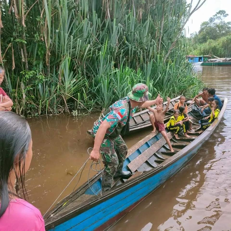 Serda Suhudi, salah satu Anggota Satgas Opster TNI Kodim Sambas saat tengah beristirahat bekerja, melakukan Komunikasi Sosial kepada anak-anak sambil bermain di sungai dan menaiki perahu kecil.
