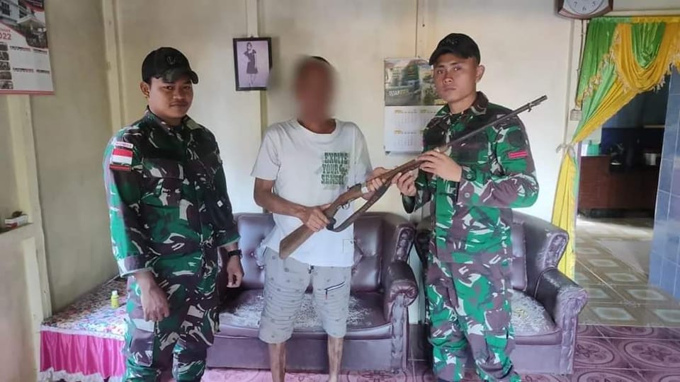 Penyerahan senpi ini bermula ketika Pratu Donny Aprilian Bagandi dan prada Ibnu Solihin anggota Pos koki Balaikarangan Satgas Pamtas Yonif 645/Gty melaksanakan anjangsana ke rumah Bpk. Patin selaku ketua RT 04 Ds. Pemodis sekaligus menanyakan situasi saat ini dan adat istiadat di wilayah desa binaan tersebut. Ketika sedang berbincang-bincang salah satu anggota Pos Koki Balai Karangan Menyinggung sekaligus menanyakan kepada Pak RT, apakah masih ada warga yang memiliki/menggunakan senjata api rakitan dan sekaligus memberikan penjelasan aturan hukum tentang bahayanya memiliki/mengunakan senjata api rakitan tersebut. Ujar Dansatgas