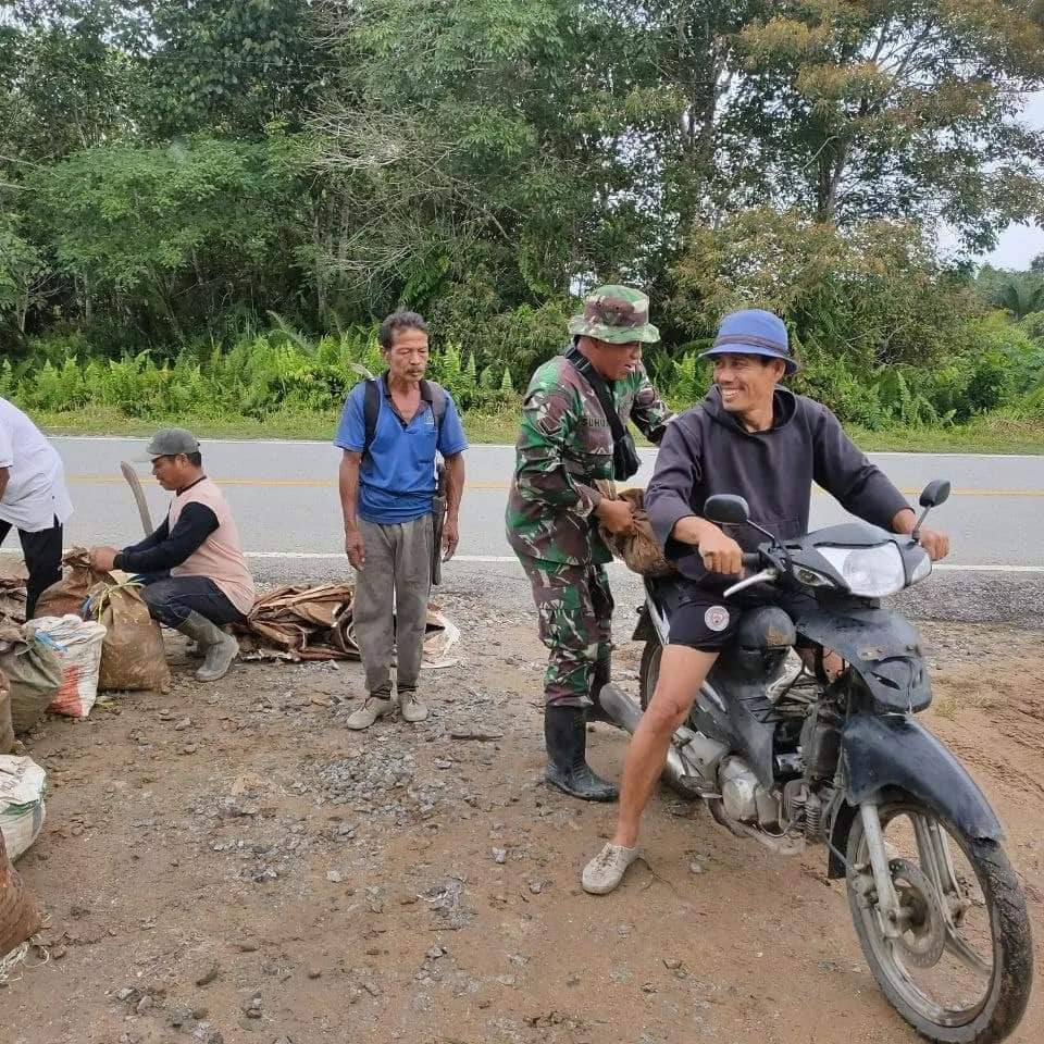 Sambas – Semangat dan penuh rasa gembira Personel Satgas Opster TNI Kodim Sambas dan masyrakat mengangkut material pasir dan batu ke lokasi pembangunan jalan salah satu sasaran Opster TNI mengunakan Motor pribadi yang berada di Dusun Sasak, Desa Santaban, Kec. Sajingan Besar, Senin (12/09/2022).