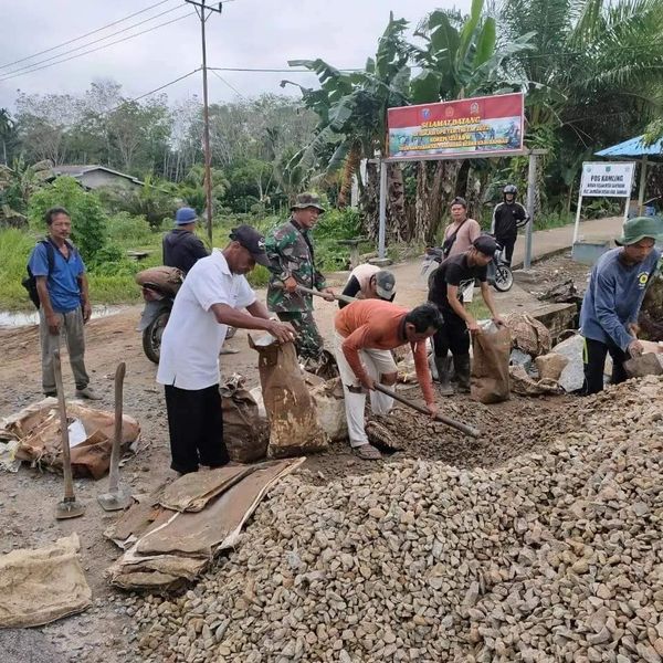 Terlihat Anggota Satgas Opster TNI Kodim Sambas Bersama Warga sangat semangat dalam mengangkut bahan material yang diperlukan dan juga mengadon campuran bahan untuk dicorkan ke jalan rabat beton tersebut.