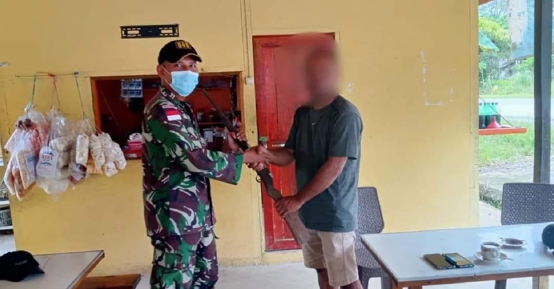 Sanggau, Kalbar – Bermula dari kegiatan anjangsana yang sering dilakukan Prajurit Pos koki Balaikarangan Satgas Pamtas Yonif 645/GTY, salah seorang warga perbatasan karena selalu dibantu anggota satgas pamtas diberikan pengobatan gratis maupun dibantu ketika dalam kesulitan dengan secara sukarela menyerahkan 1 (satu) pucuk senjata api rakitan jenis Lantak pada saat pelaksanaan kegiatan anjangsana pengobatan gratis dari rumah ke rumah, bertempat di Desa. Pemodis RT 02 Kec. Beduai Kab. Sanggau.