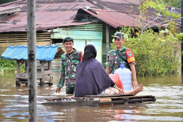 Sintang – Babinsa Koramil 1205-07/Sintang, Kopda Ikhsan melakukan monitoring banjir yang terjadi di wilayah binaannya, Minggu (16/10/2022).