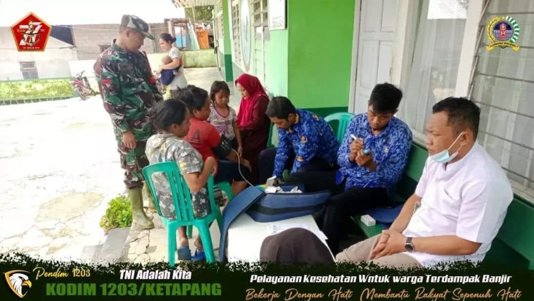 Ketapang – Koramil 1203-06/Manismata jajaran Kodim 1203/Ktp bersama Tim medis Puskesmas Manismata menggelar kegiatan pelayanan kesehatan pengobatan gratis kepada masyarakat yang terdampak banjir di wilayah