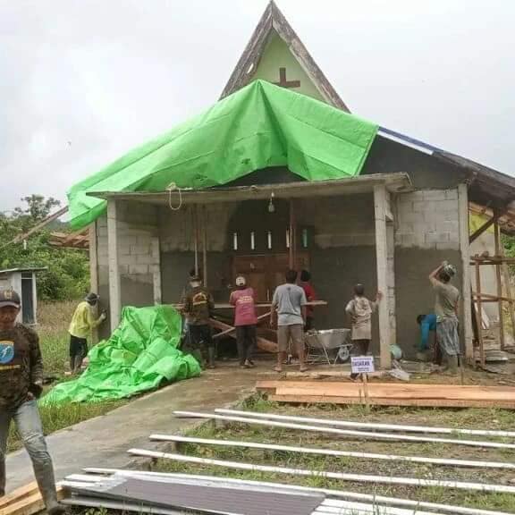 Singkawang – Perehapan gereja ukuran 6meter x12 meter,warga di Kel.Pangmilang,Kec.Singkawang Selatan trans SP II sangat bersyukur dan menanti tampilan baru Gereja mereka,warga disana bergotong royong membantu Satuan Tugas (Satgas) TNI Manunggal Membangun Desa (TMMD) ke-115 Kodim 1202/Skw.